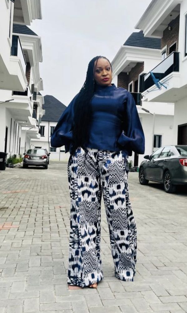 - The combination of the solid satin top with the patterned wide-leg trousers creates a chic and sophisticated look.
